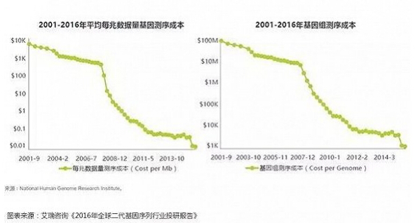 目前,高通量测序设备的广泛应用,基因数据量也呈倍数增长,基因组序列测序成本大幅下降。2016年5月,艾瑞咨询发布《2016年全球二代基因序列行业投研报告》中提到,平均每兆数据量基因测序成本和单人类基因测序成本都有超“摩尔定律”的大幅度下降,2001年人类基因组测序成本高达9526.3万美元,但如今单人类基因组测序成本已下降到几千美元。