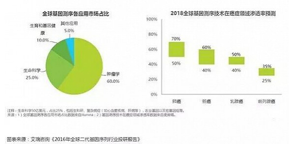 根据艾瑞咨询发布《2016年全球二代基因序列行业投研报告》预测,癌症的诊断治疗应用将是基因测序最具潜力的应用市场。