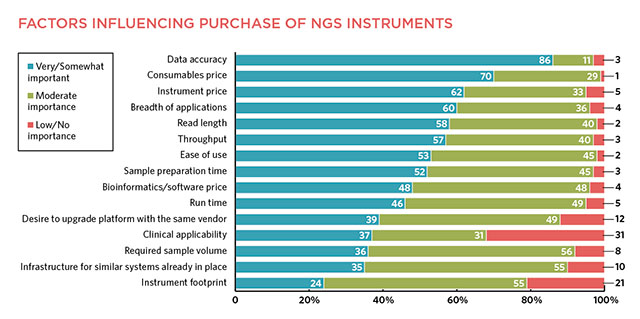 调查显示,数据的准确性和操作成本,这两者是购买测序设备的最重要采购标准。但是如果两种仪器的数据精确度相同,那么操作成本、应用的广泛性,读长和通量就成为了第二重要的参考因素。