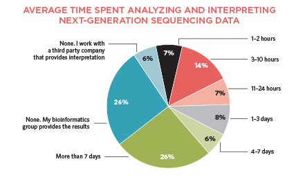 NGS 工作流程的最大瓶颈是分析和注释数据所花费的时间太长。有四分之一的研究人员表示NGS数据分析需要至少一周时间,还有32%的受访者将这一工作外包给其他生物信息学组同事或第三方公司。