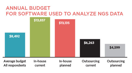 每年NGS 数据注释软件的预算是外包费用的两倍多,目前NGS 软件整体平均预算约为8,500 美元,不过这一数据还表明,内部和外包所花费的费用存在巨大差异,前者的费用约为13,000- 14,000美元,后者的费用为4500-6300 美元)。