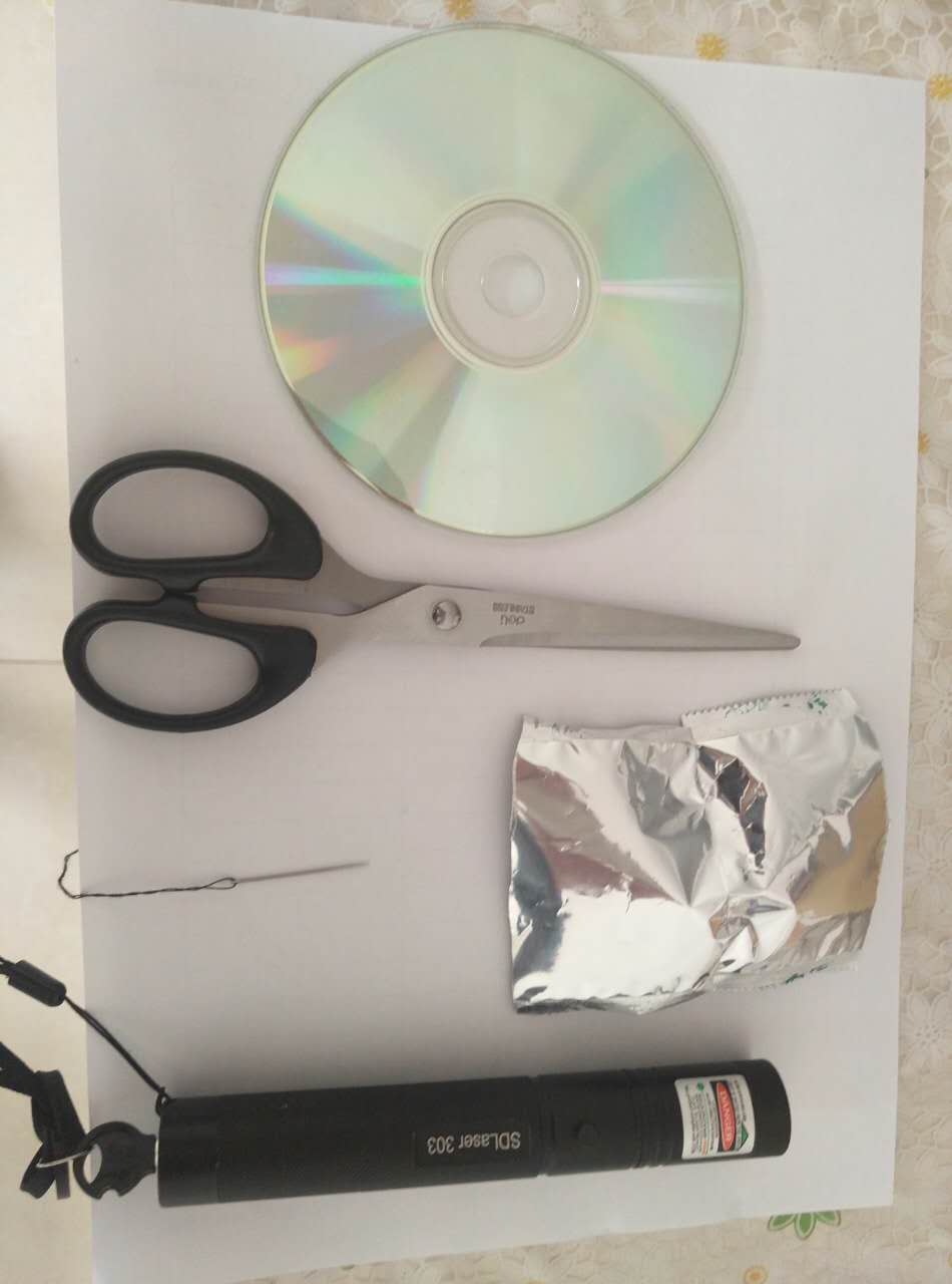 材料:激光笔,针,光盘(CD 和DVD),剪刀,包装纸(铝箔),再平常不过的东西。见下图